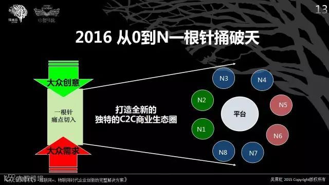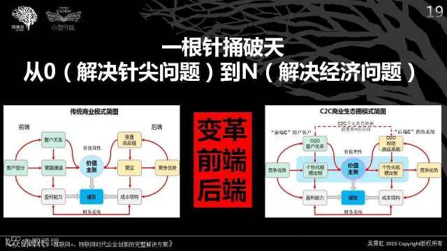 结论:2016年,对于个人、企业、国家来说,与传统的商业模式对比,C2C商业生态圈模式的一根针捅破天,可以从0开始,在市场的前端解决用户的针尖问题,逐步发展到N,驱动供应侧后端解决产业转型、和经济升级问题,形成一个闭环。