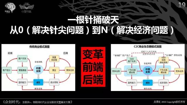 2)基于自身能力的决策:对于个人、企业的能力来说,要么整合他人建立C2C商业生态圈平台;要么被他人整合进入一个平台,成为生态的一个微生物;或者,干脆退出,以资本的方式加入那些与商业大趋势同行的投资基金,也是一个不错的选择。无论哪一个决定,都离不开最基本的价值主张、盈利模式、以及实现方式。