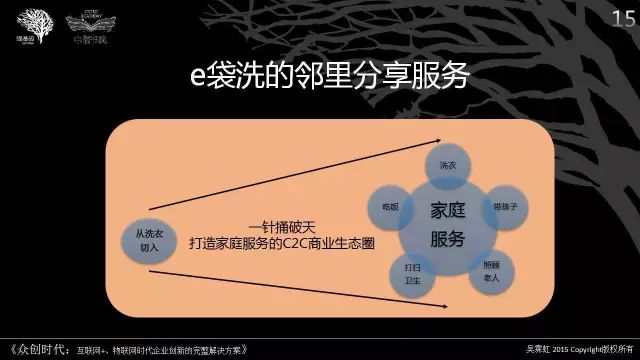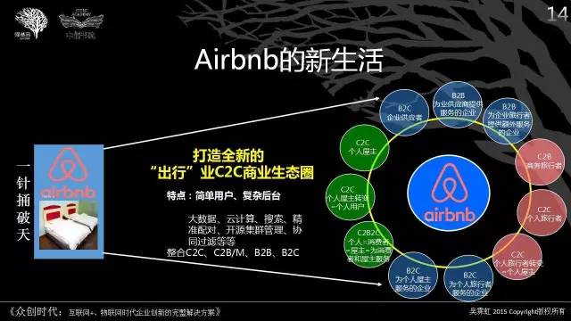 例如,Airbnb的一根针,就是从出租自己间房的空间开始的,之后以科学的智能交互平台解决方案,精准配对住房者与房东主,发展为驱动打造全新的出行商业生态圈。其特点是:人文关怀简单用户、智能交互复杂后台,以大数据、云计算、搜索、精准配对、开源集群管理、协同过滤等等逐步整合了C2C、C2B/M、B2B、B2C等与出行有关的商业生态圈,历经八年才发展成“天大”的商业版图。
