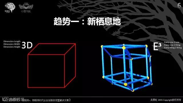 商业正在从物理世界,向万物连接的E³世界大迁移。创业、转型、创新的一切元素也渗透了E³的三层含义:人与人、人与物、物与物连接,虚实交错。意味着互联网、物联网、人机智能等不仅仅是商业的必备工具,更重要的是,它们已经成为人类生存和发展不可替代的阳光、空气和土壤,并渗透进我们的心灵、思想和身体,成为商业生命的新栖息地。如果事业没有长在这样的土壤上,迟早会夭折。