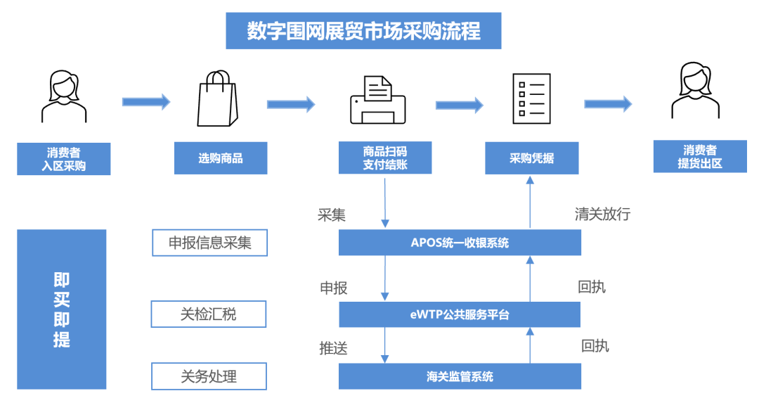 数字围网区内的商户通过APOS系统进行商品流、订单流及资金流管理。货物出入区通过eWTP数字清关实现快速清关,让终端消费者自由进出义乌综保区,像在普通市场购物一样便利,极大地提升了消费者跨境购物体验。
