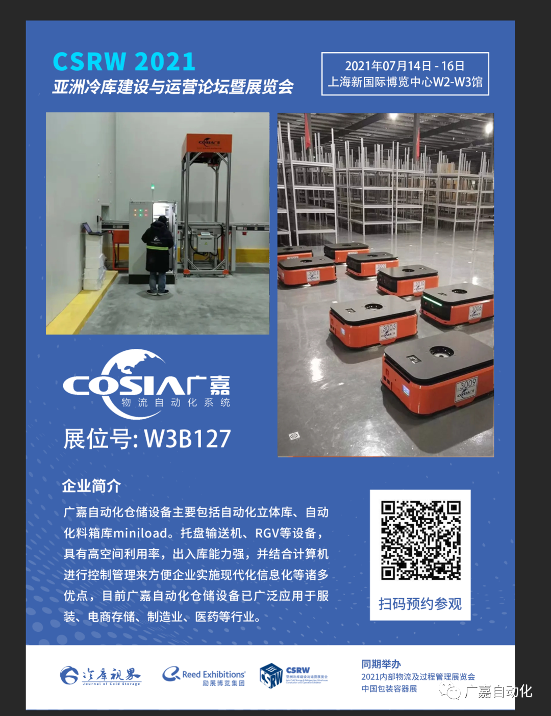 2021年7月14-16日,亚洲冷库建设与运营论坛暨展览会(简称CSRW冷库展),将在上海新国际博览中心举行。行业大咖齐聚,聚焦行业热点,共话前瞻思考。长期致力于生鲜冷链物流自动化的广嘉自动化将亮相本次展会(展位号W3B127),为客户呈现冷库自动化解决方案与相关案例,期待您的光临!