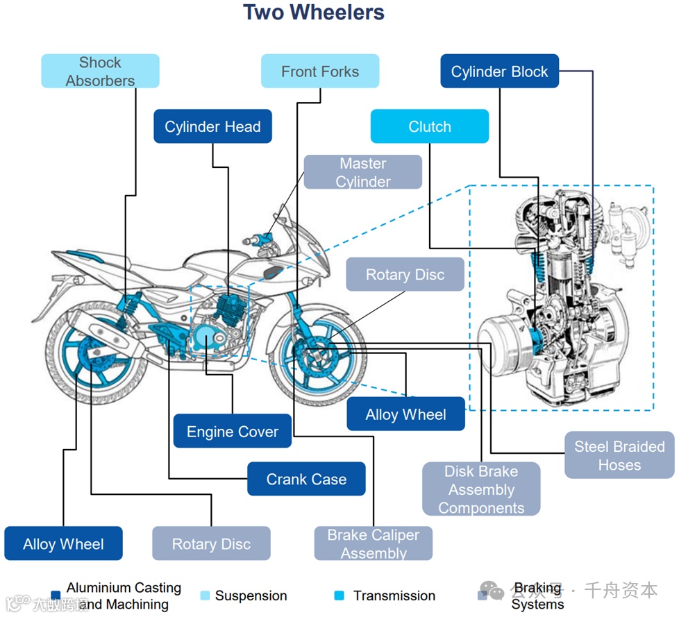 两轮:主要产品为铝铸件及机械加工(Aluminium Casting and Machining)、悬架(Suspension)、传动装置(Transmission)与制动装置(Braking)