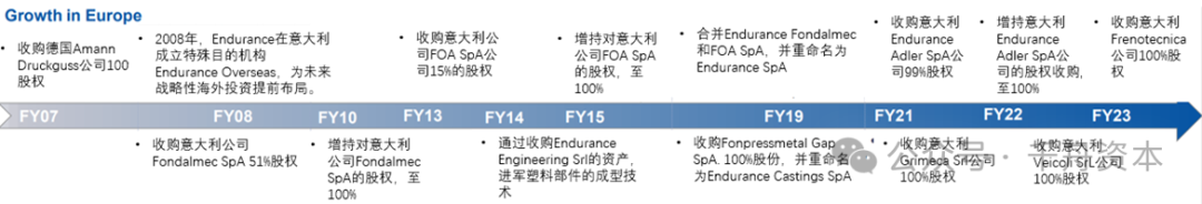 2008年,收购意大利铸件和机加工公司Fondalmec SpA (EF SpA) 51%的股权,进一步扩大了在欧洲市场份额(2010年完成余下股权收购)。同时,Endurance在意大利成立Endurance Overseas Srl(EOSrl),为未来战略性海外投资提前布局。