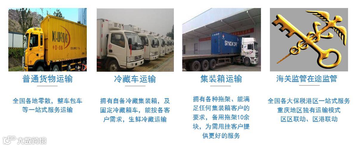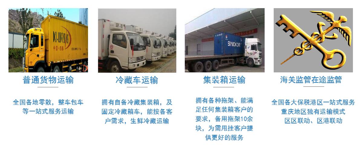 海关监管集卡车 18 辆、海关监管箱式车 21 辆、海关在途监管车 39 辆,可接保税一线、二线货物和普通货物运输,具备进入达丰、富士康等大型工厂的通行资质,可以满足不同客户需求,所有车辆具备海关监管、重庆在途监管双资质。