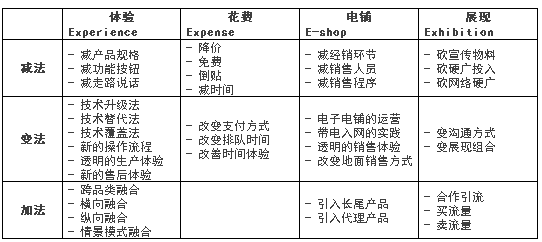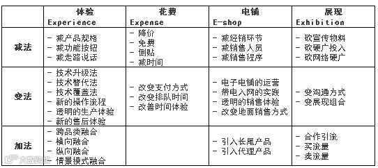 把以上这三个催化剂分别滴到4E中,会发现大量的创新机会和商业手法,我们尝试着用一个表来简单试试,你会发觉目前已经实践出来的几乎所有互联网新玩法无不可以被囊括其中;当然,你一定还可以发现更多的化学反应,重要的是,你能按照这些发现来重新设计新的商业模式、制定新的营销战略。