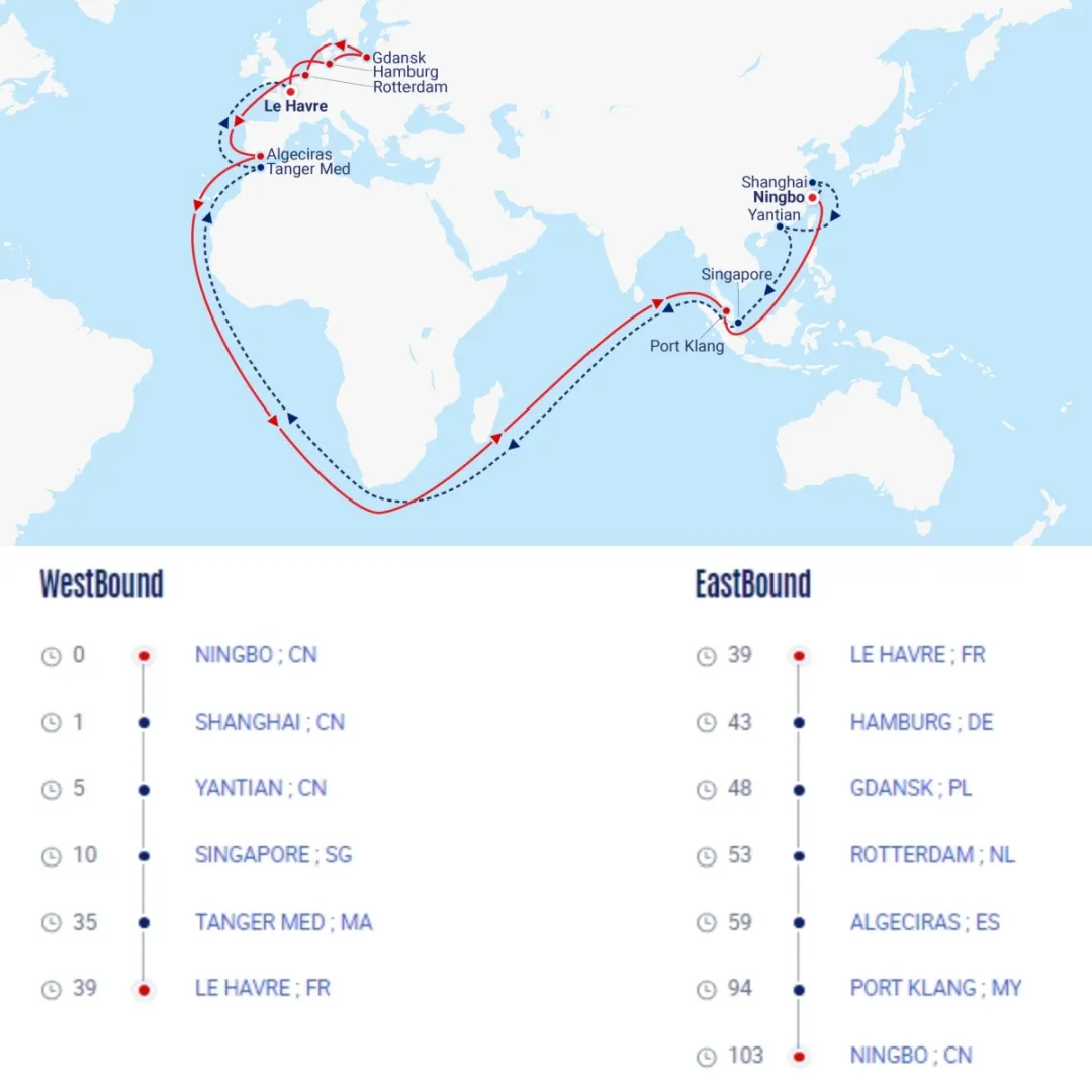 据悉,“CMA CGM Benjamin Franklin”集装箱船(IMO:9706891)建造于2015年,悬挂马耳他国旗,运力为17859TEU,服务于海洋联盟--达飞轮船的French Asia Line 1(FAL)航线,该航线因红海地区的安全局势而临时调整航线,选择绕行好望角。