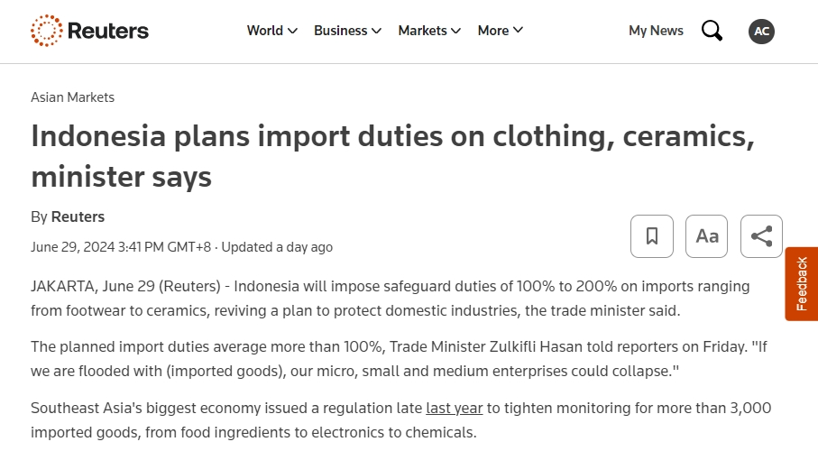 印度尼西亚,作为东南亚最大的经济体,近日宣布了一项旨在“保护国内产业”的重大计划。据路透社等媒体报道,印尼贸易部长Zulkifli Hasan6月28日在公开场合表示,印尼将对鞋类、服装、纺织品、化妆品和陶瓷等进口产品征收100%至200%的保障性关税,以重启并加强对国内产业的保护措施。