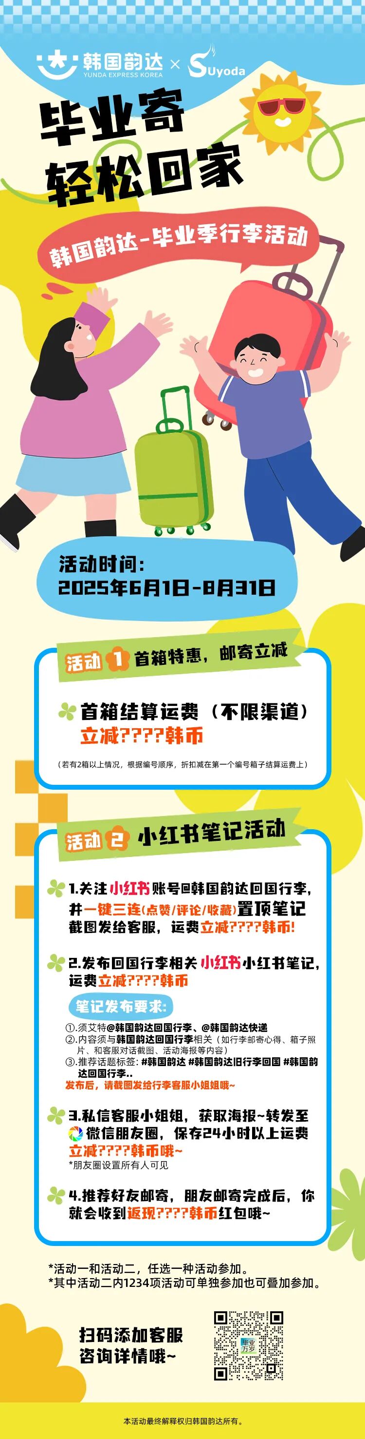 导读:YUNDA & SUYODA毕业季行李邮寄活动毕业回国/工作调任?在韩国的旧行李别烦恼!专业邮寄回国,轻松省心到家!