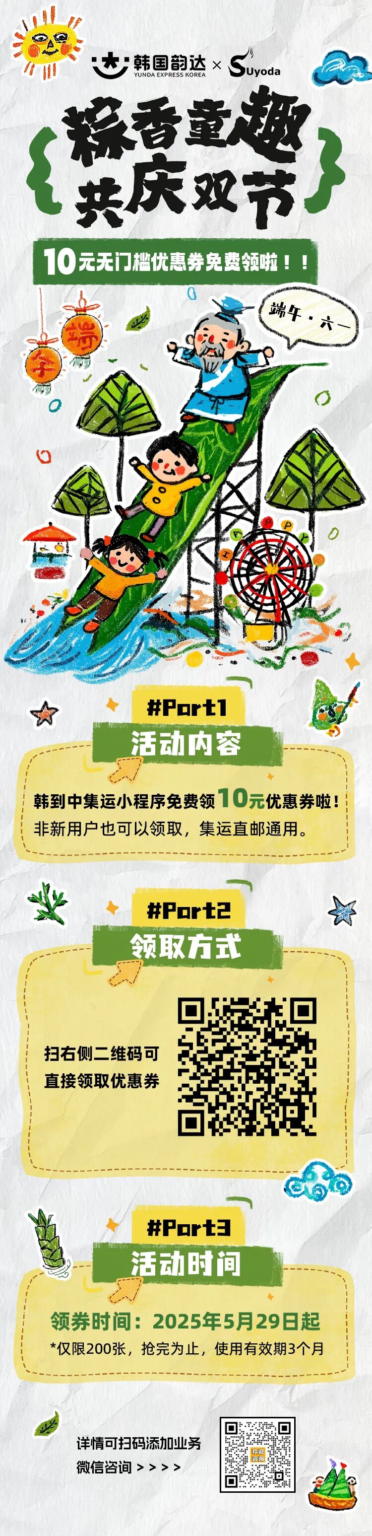 导读:YUNDA & SUYODA韩到中个物邮寄服务粽香童趣,共庆双节活动持续进行中...10无门槛优惠券免费领啦!