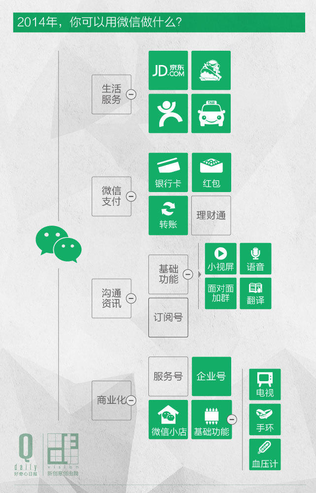 而到了2014 年末,微信显然已经在“变重”的路上走了很远。现在的微信,是电商渠道、游戏机、钱包、扫码仪和无数个简易版第三方app 的集合。微信对自己的新定位是生态系统,是平台,是“森林”。
