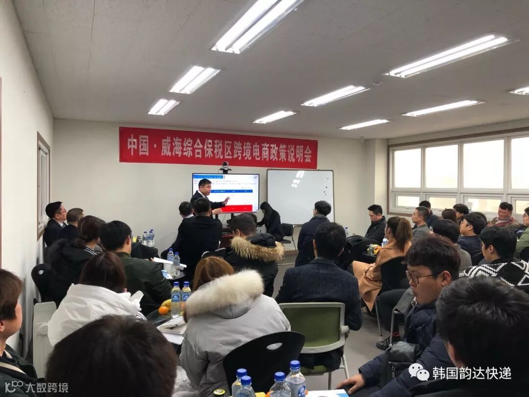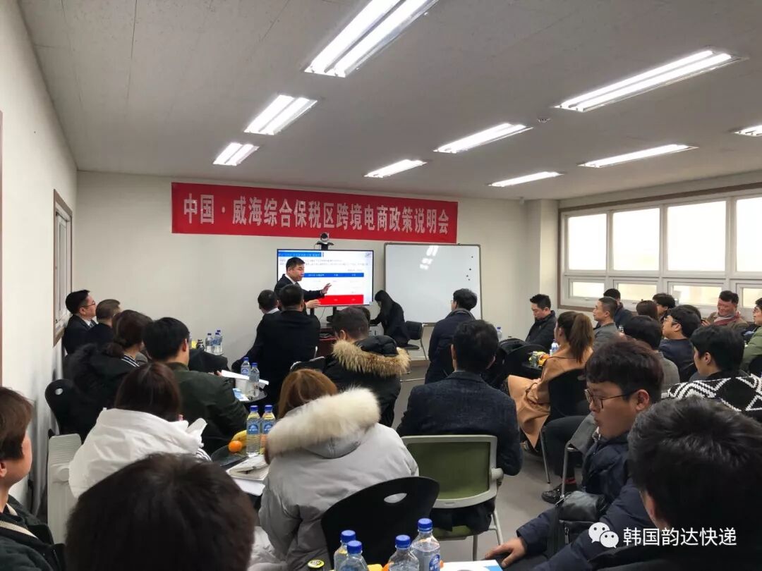 2019年1月14日,韩国韵达与威海综合保税区在韩国仁川联合举办跨境电商政策说明会,对涉及威海综合保税区跨境电商保税进口(1210)业务的相关政策及法律法规进行讲解、咨询。为使各线上平台、商家进一步了解威海综保区的相关优惠政策,会上,韩国韵达与威海综保区重点推介了威海对韩的商贸优势、物流优势、政策优势。