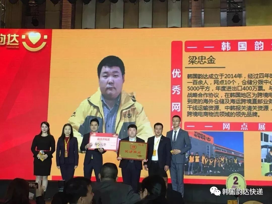 2019年1月,韩国韵达参加韵达第十九届网络大会。会上,凭借对快件全程全网全流程各环节的信息化、科技化、规范化、标准化赋能,持续提高揽派、分拨和转运能力,以及对快运、仓储、供应链等业务的延伸,蝉联“优秀网点”称号。