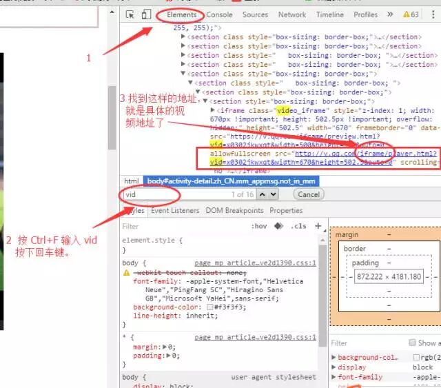 找到源代码后,按下Ctrl+F,输入 vid 检索,其中,有一个 vid 周围有一个链接地址,是v.qq.com 的,还有一个关键单词可以辨识:iframe,看到这个单词,可以确认我们要的东西已经找到啦。