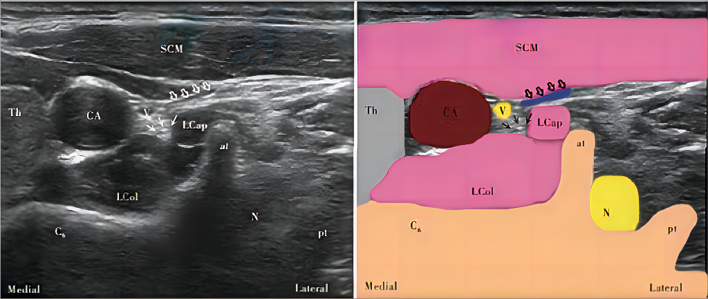 SCM 为胸锁乳突肌,CA为颈总动脉,Th为甲状腺,C6为第6颈椎,LCol为颈长肌, LCap为头长肌,at为横突前结节,pt为横突后结节,N为颈6神经根;实心箭头为颈交感链,空心箭头为压闭的颈内静脉;Medial为内侧,Lateral为外侧