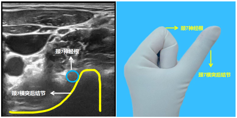 如何在超声引导下快速精准定位星状神经节?星状神经节位于C6和C7椎体之间、颈长肌表面。C7横突与SG的距离最近,是标定SG体表投影的最佳骨性标志,但是C7横突没有前结节,椎动脉未受椎动脉孔保护,在此穿刺容易伤及椎动脉。临床多以C6横突为解剖定位,从而决定星状神经节阻滞穿刺点。下面通过一套简单易懂的手势,学会快速精准定位星状神经节[5]:首先将探头放至锁骨上窝,比出“大拇指朝上”的手势,大拇指为C7横突后结节,屈曲的四指为C7神经根,探头向上继续移动,比出形似“八”的手势,大拇指为C6横突后结节,食指为C6横突前结节,屈曲的三指为C6神经根,确定C6横突后,缓慢移动探头,直至可以清楚地显示颈长肌、椎前筋膜,星状神经节阻滞点位于颈长肌前方、椎前筋膜深面。