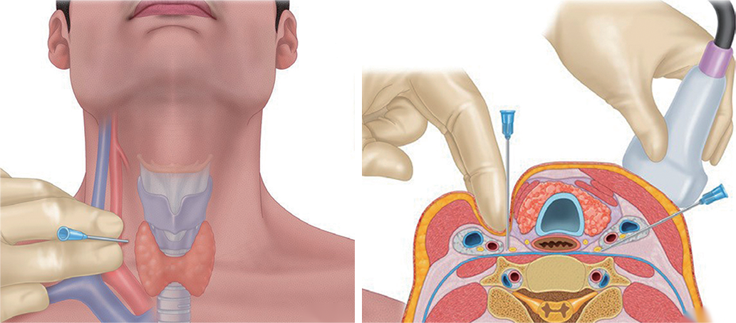 传统气管旁定位法和超声引导下SGB定位穿刺[3]