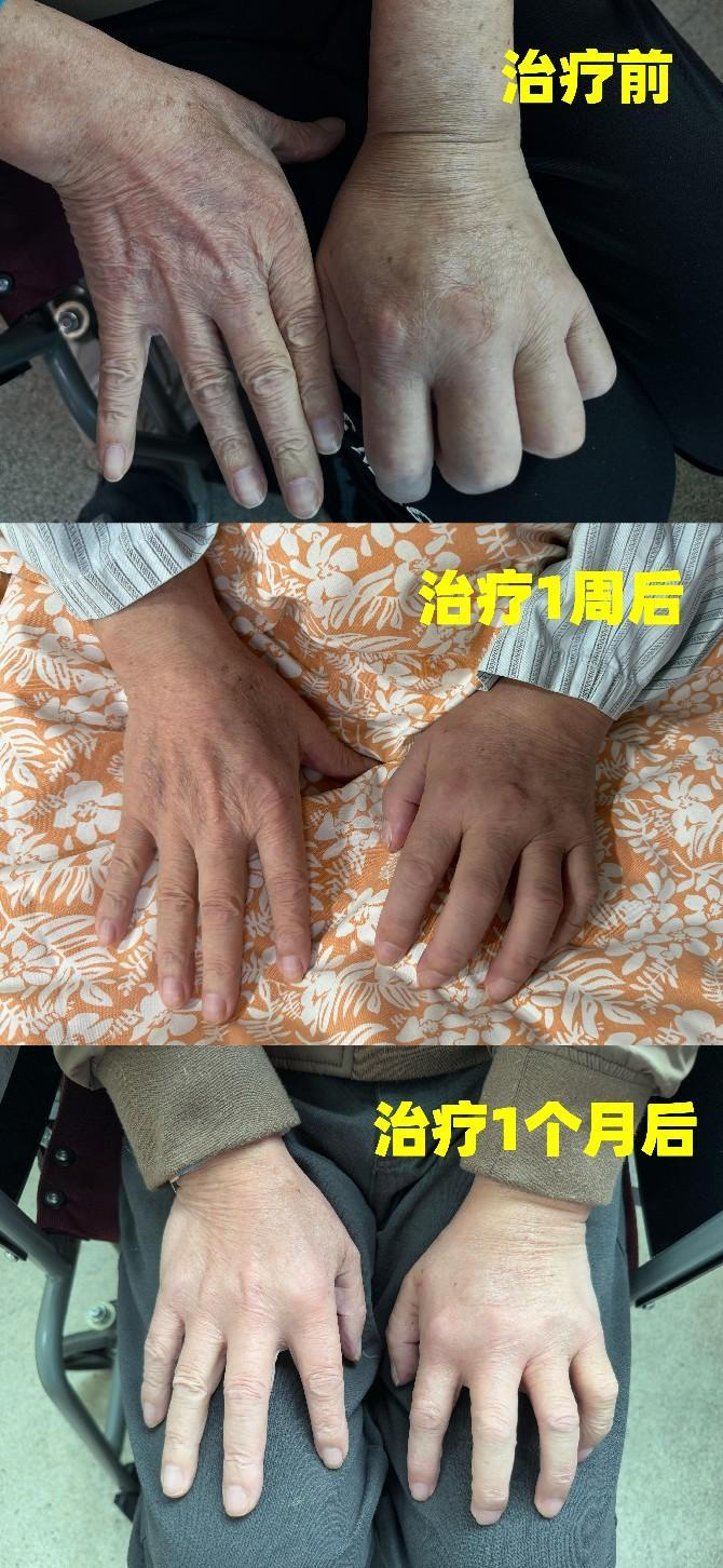 治疗效果反馈:连续治疗1周后患者左侧肩部腕部手指疼痛、左手肿胀的症状明显缓解,各关节活动度增加,皮温降低,患者及家属都感到非常高兴,对我们的治疗方案给予积极的肯定,VAS评分由8分降为2分,出院后1个月,再次随访患者目前肩手综合征恢复情况,患者表示疼痛已完全消失,VAS评分为0分。