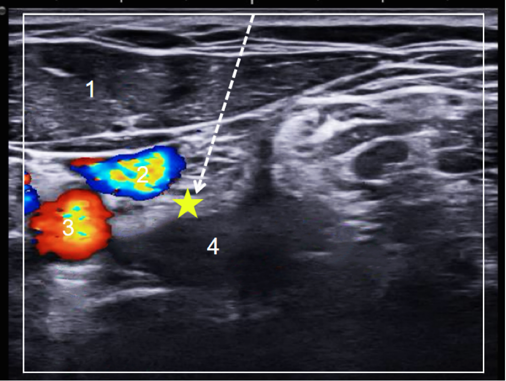 ⭐为星状神经节阻滞定位点,虚线箭头为平面外穿刺路径