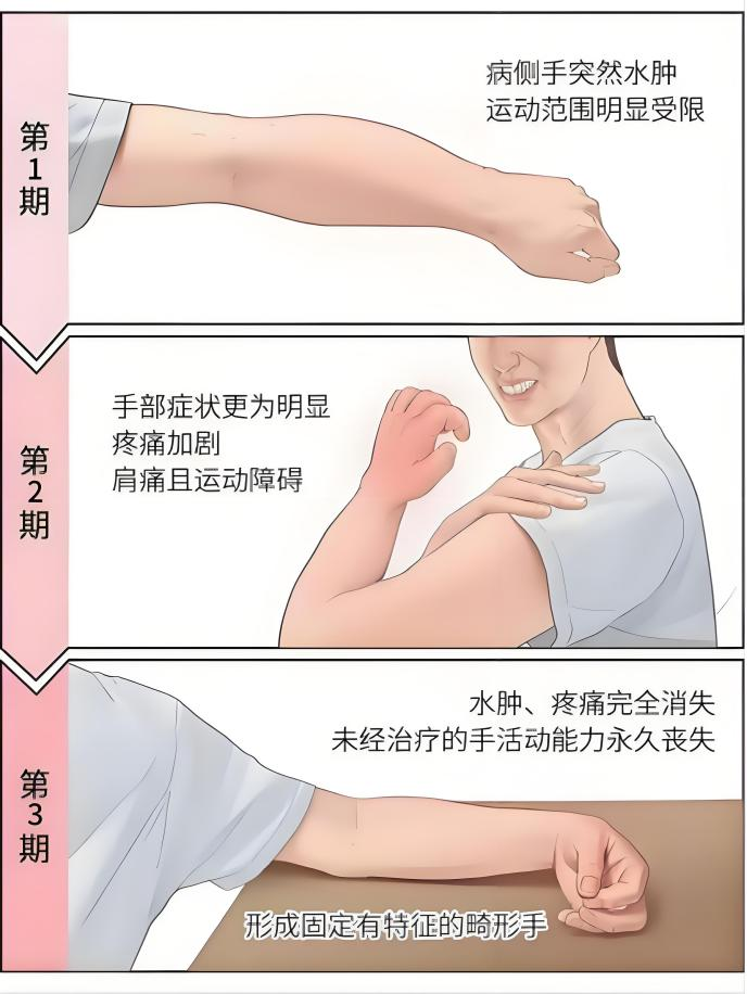 什么是肩手综合征?肩手综合征( shoulder-hand syndrome,SHS)是脑卒中常见的并发症,又称反射性交感神经营养不良,临床表现主要为偏瘫侧上肢疼痛、感觉异常、血管功能障碍、水肿、出汗异常、营养障碍及运动障碍等,影响患者肢体功能恢复。根据临床症状的不同,脑卒中后肩手综合征可分为3期[1]:其中1期发病率最高,通常表现为肩手关节突然出现肿痛,并伴有活动受限,持续时间为3~6个月,如果没有进行及时的干预治疗,病情进展到2期,疼痛加重,水肿减轻,出现皮肤肌肉萎缩,进一步限制活动,若病情进一步发展到3期,肩手关节功能受限加重,手指出现挛缩,形成畸形手,为不可逆的终末阶段,患手完全失用,最终可能导致残疾,日常生活能力严重受限。