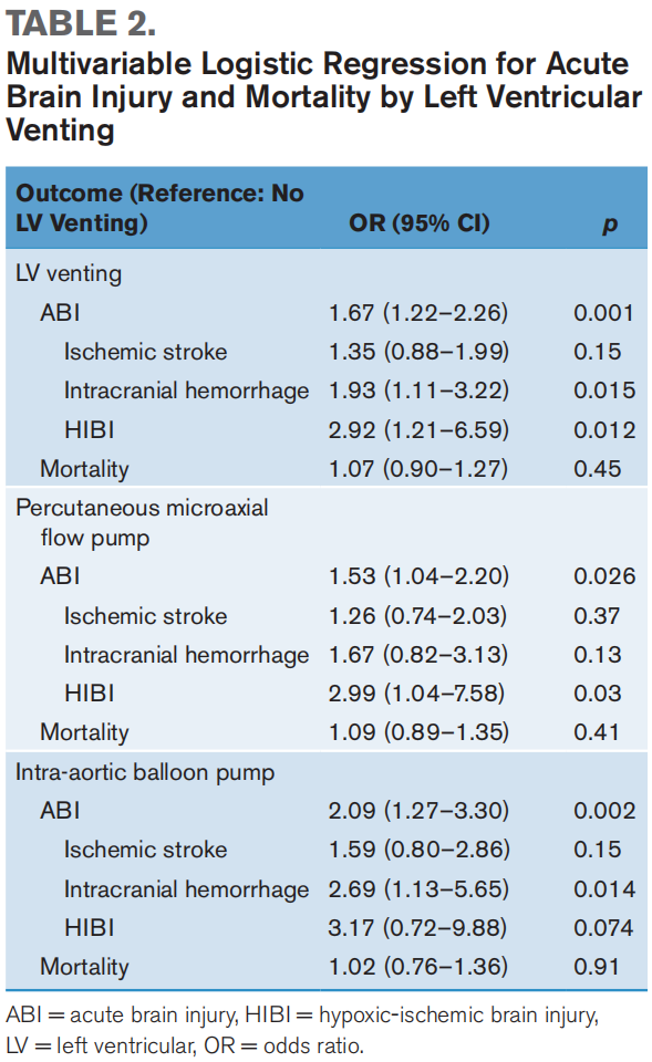 我们的研究结果与现有少数几项将左心室减压与接受静脉-动脉体外膜肺氧合(VA-ECMO)患者发生急性脑损伤(ABI)风险增加相关联的研究结论一致,特别是出血并发症风险的显著升高。然而,一项针对2010至2019年间接受VA-ECMO治疗患者左心室减压结局的研究发现,减压组与非减压组患者的颅内出血(ICH)发生率及缺血性卒中(IS)发生几率均无显著差异。需要强调的是,该研究对减压策略的分类较为宽泛,且缺乏针对不同装置具体影响的详细数据——特别是微轴流泵(mAFP)与主动脉内球囊反搏(IABP)相较于不行左心室减压的对比数据。相比之下,我们的研究采用了更新的数据且分类更为精细,这使得我们能够评估不同左心室减压方式对特定类型急性脑损伤的差异化影响。值得注意的是,上述同一研究在比较接受IABP与经皮心室辅助装置的患者时发现,IABP患者的ICH和IS发生率与对照组相当,这一发现与我们的研究结果相符。关于左心室减压背景下ABI风险的既往文献更多细节,详见补充表7(https://links.lww.com/CCM/H814)。