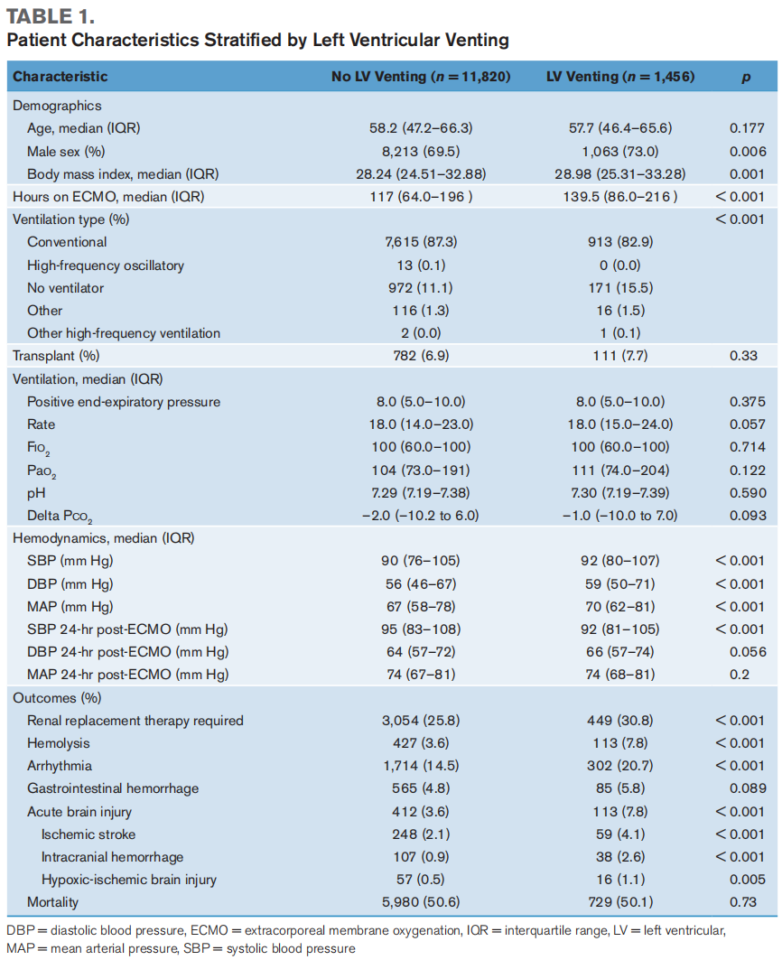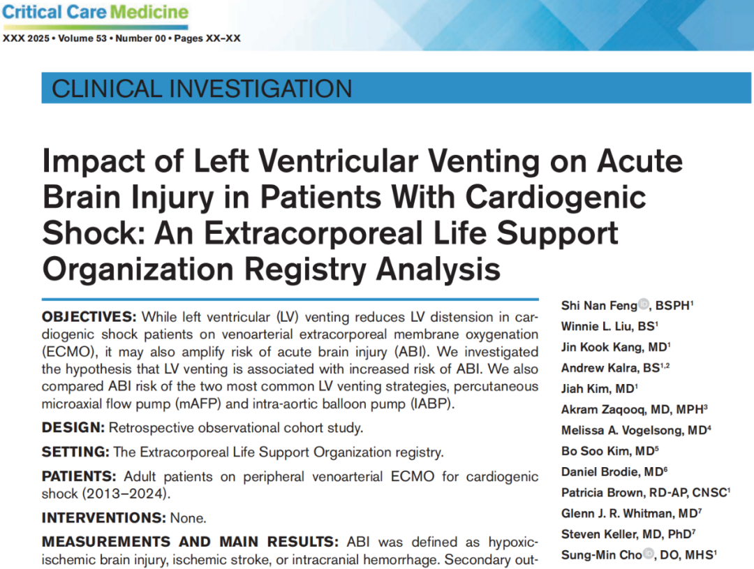 在这项多中心ELSO注册系统分析中,我们发现对于因心源性休克接受外周静脉-动脉ECMO治疗的患者,左心室减压与急性脑损伤(ABI)风险增加相关,但与死亡率无关。值得注意的是,在缺血性卒中(IS)发生风险方面,左心室减压组、微轴流泵(mAFP)组及主动脉内球囊反搏(IABP)组与未行左心室减压组之间均无显著差异;然而,与未减压组相比,左心室减压患者及接受IABP支持患者的颅内出血(ICH)风险均有所升高。此外,与未行左心室减压的患者相比,接受减压治疗的患者发生缺氧缺血性脑损伤(HIBI)的风险更高。最后,通过倾向评分匹配后我们发现,在静脉-动脉ECMO支持期间,接受IABP与mAFP治疗的患者在ABI发生风险及死亡率方面均无显著差异。
