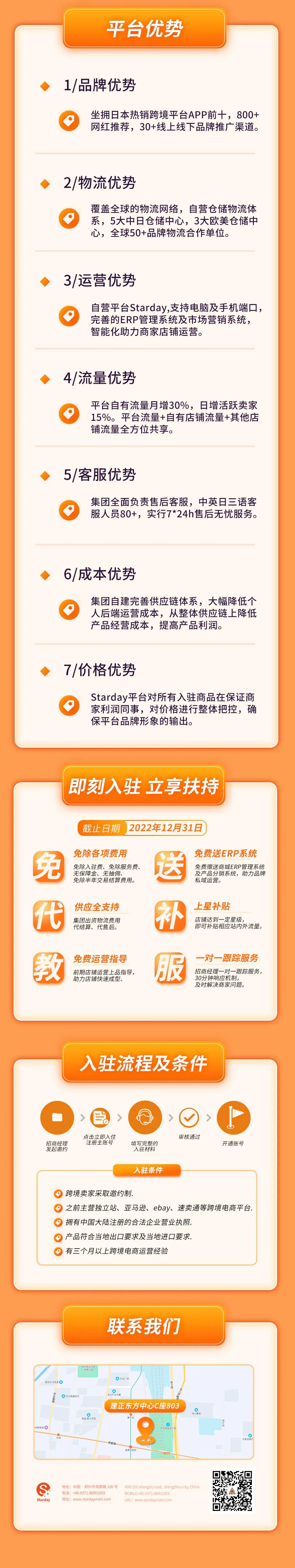 Starday成立于2015年,是面向全球市场的跨境电商服务平台。Starday拥有完整的供应链体系,在配送时效、价格、安全、服务等方面具有巨大优势。本官方公众号致力于为中国跨境卖家提供招商信息、平台政策、活动资讯及运营干货。