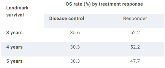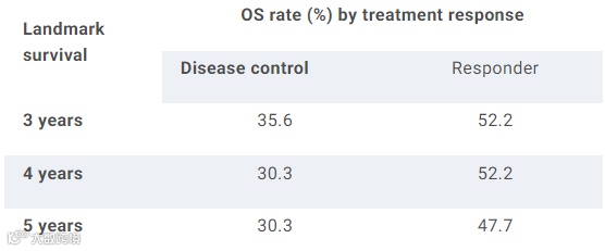 表1. 按治疗反应分层的接受atezo+bev治疗患者的3年、4年和5年OS.