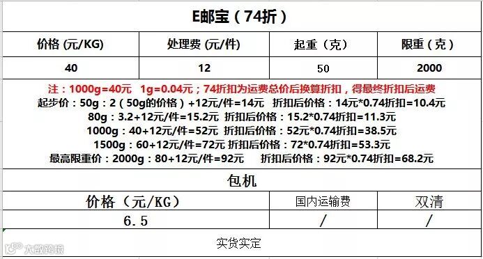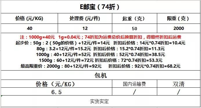 4、给与商家7.4折物流优惠(国际件),以邮政为例:邮政收费标准为40元/KG+15元/件(处理费) 交由Starday中转仓代发价格为(40元/KG+12元/件)*0.74。