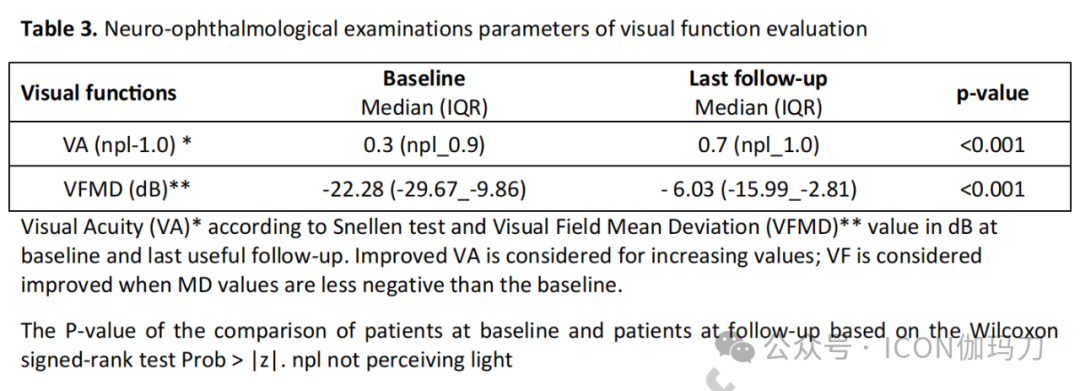具体而言,在视神经损伤的情况下,评估视力(VA)和视野(VF)。通过光学相干断层扫描(OCT)检测到的神经形态学变化,如神经厚度的增加或减少,由经验丰富的神经眼科医生评估为病理。这些变化被认为与临界VA和VF值有关。排除标准包括:对放射对比剂过敏、妊娠、累及双侧的脑膜瘤或视交叉。