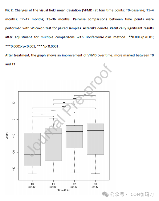 图2。四个时间点的视野平均偏差(VFMD)变化:T0=基线;T1 = 4个月;T2 = 12个月;T3 = 36个月。时间点间的两两比较采用配对样本的Wilcoxon检验。星号表示采用Bonferroni-Holm方法进行多重比较调整后结果具有统计学意义:**0.001<p<0.01;* * * 0.0001 < p < 0.001;* * * * p < 0.0001。治疗后,该图显示VFMD随时间的改善,在T0和T1之间更为明显。