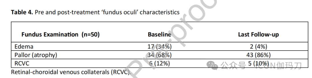 随访期间视盘水肿2例(4%),视盘苍白43例(86%),RCVC 5例(10%)(表4)。17例患者中有1例眼球突出症得到改善。随访期间未见视网膜病变。新发白内障12例(24%)。