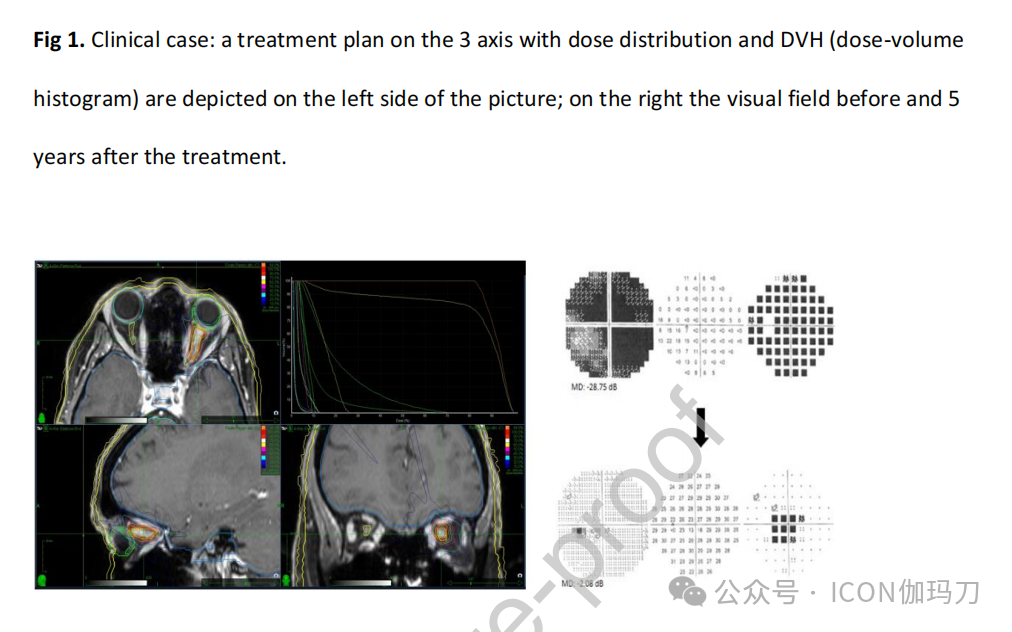 图1。临床病例:3个轴位像为治疗方案,左侧为剂量分布和DVH(剂量-体积直方图);右边是治疗前和治疗后5年的视野。