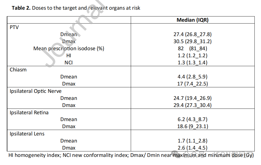 该研究的主要终点是通过不良事件(AE)的频率来评估大分割RS的安全性。AE定义为在大分割RS治疗后出现任何新的神经或视力障碍,或任何先前缺陷的恶化。这些事件是根据美国国家癌症研究所不良事件通用术语标准4.0版(CTCAEv4.0) 16定义的,记录了所有类型的神经和眼部症状。计划接受大分割RS的患者以意向治疗(ITT)为基础入组。