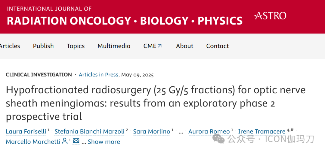 《Int J Radiat Oncol Biol Phys》 2025 年5月9日在线发表Fondazione IRCCS Istituto Neurologico Carlo Besta,的Laura Fariselli , Stefania Bianchi Marzoli , Sara Morlino,等撰写的《视神经鞘脑膜瘤的大分割放射外科(25 Gy/分5次):一项探索性2期前瞻性试验的结果,Hypofractionated radiosurgery (25 Gy/5 fractions) for optic nerve sheath meningiomas: results from an exploratory phase 2 prospective trial》(doi: 10.1016/j.ijrobp.2025.04.038. )。