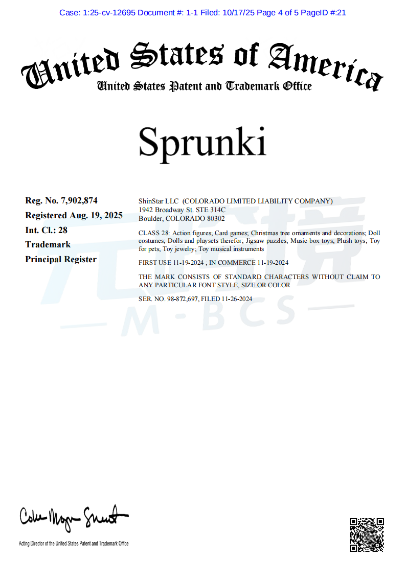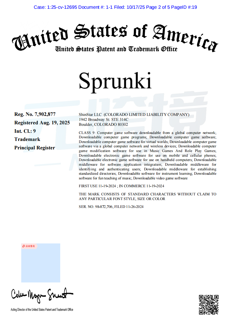 【25-cv-12839】GBC新案发力,代理SPRUNKI游戏商标及版权连发三案!