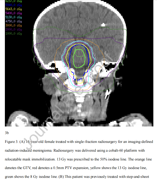 图3 (A) 14岁女性,影像学明确放射诱导脑膜瘤,接受单次放射手外科治疗。放射外科使用钴-60平台和可重新定位的面罩固定。按50%等剂量线照射13 Gy。橙色线为GTV,红色线为0.5mm PTV外扩,黄色线为13 Gy等剂量线,绿色线为8 Gy等剂量线。(B)该患者在放射外科治疗前11年曾因第四脑室复发性脉络膜丛乳头状瘤(33次59.4 Gy)分次照射IMRT治疗。辐射诱发的脑膜瘤区域受照在10-20 Gy之间。