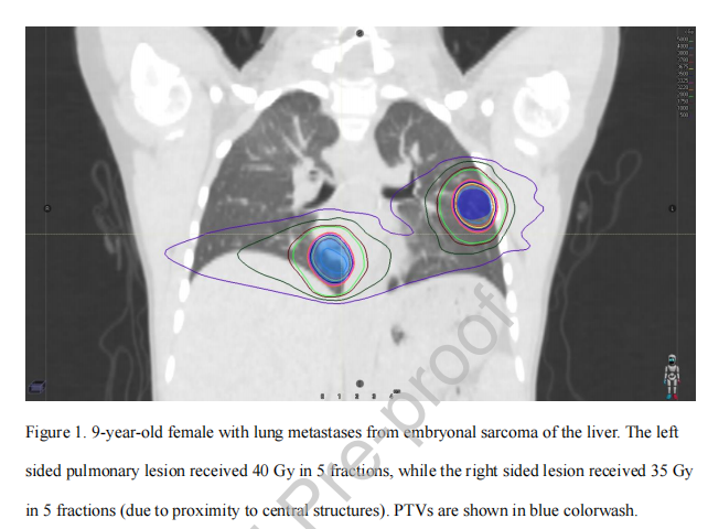 图1。 19岁女性,肝胚胎性肉瘤肺转移。左侧肺病变接受5次40 Gy,(由于靠近中心结构)右侧病变5次接受35 Gy的照射。TV显示为蓝色。表1.颅外SBRT在儿童和年轻人中的选择性研究。