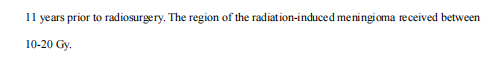 儿科的单次SRS剂量取决于特定的组织学,良性肿瘤的剂量范围为12-24 Gy,恶性病变的剂量范围为15-24 Gy , AVM的剂量范围为15-25 Gy。