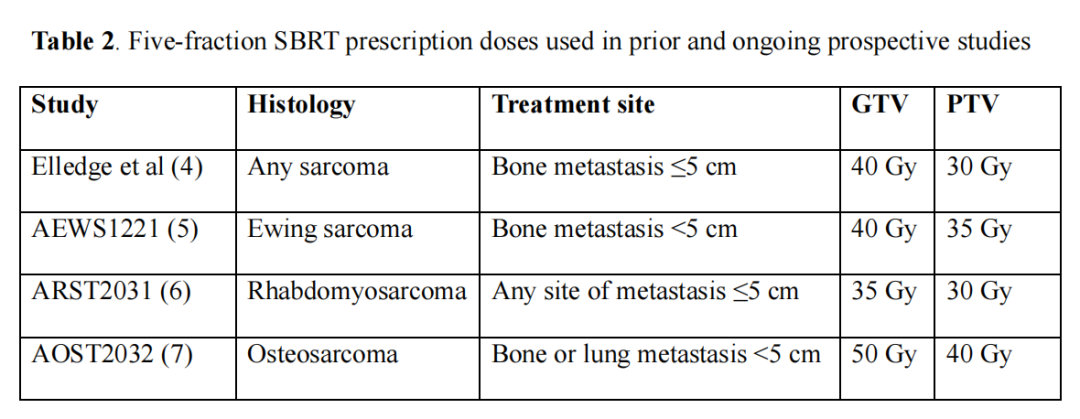 SBRT在儿童中的应用存在广泛的异质性。欧洲儿科肿瘤学会(SIOPE)对欧洲20个儿科中心进行了一项调查。大多数中心(约65%)同意儿童转移性疾病可以以治疗为目的进行治疗。一半的响应中心没有最大数量的转移性病变,这将作为治愈性或姑息性意图治疗之间的阈值。在使用SBRT的组中,没有就推荐剂量分次达成一致;方案范围按分1-7次照射16-50 Gy。国家儿童癌症基金会的指南建议,对于骨或软组织尤文氏肉瘤或横纹肌肉瘤转移小于5厘米的患者,SBRT的剂量为30-40 Gy,分5次进行。