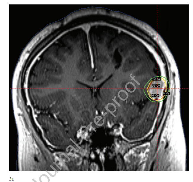 图4 。13岁男性,左侧深部动静脉畸形位于运动皮层附近。病变采用钴-60平台框架固定治疗。处方为15Gy,按50%等剂量线(黄线)。8Gy等剂量线用绿色表示。