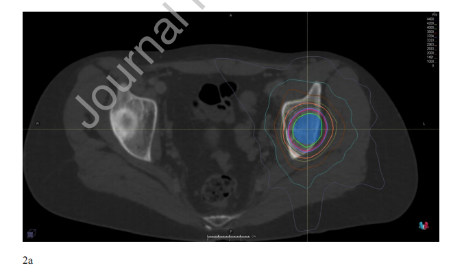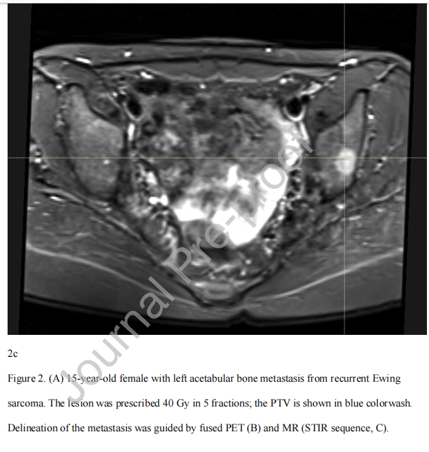 图2。 (A)复发性尤文氏肉瘤左侧髋臼骨转移的15岁女性。病灶分5次给予40 Gy;PTV显示为蓝色。通过融合PET (B)和MR (STIR序列,C)定位转移灶。