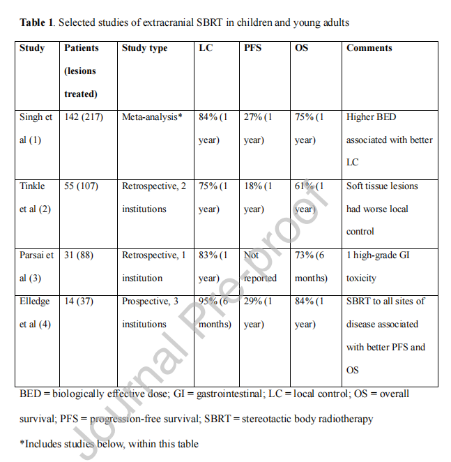 尽管表1中列出的研究有良好的局部控制概率,但SBRT后远处进展的风险非常高(1年PFS小于30%)。因此,目前尚不清楚有多少儿童有可能通过SBRT治愈,就像有时在成人中看到的那样;例如,SABR-COMET的5年PFS为17%。这可能是由于儿童癌症的优势,如尤文氏肉瘤(30)和横纹肌肉瘤,在其疾病过程中发生转寡移性扩散。对于接受SBRT治疗的儿童,尽管1年PFS较低,但1年OS为75%,强调了全身治疗在SBRT治疗后远处复发后控制疾病的重要性。同样重要的是要记住,儿童癌症的前期治疗通常包括非常强化的全身治疗,与接受强度低于儿童的全身治疗的成人患者相比,这种治疗后复发的患者可能患有更多生物学上不利的疾病。