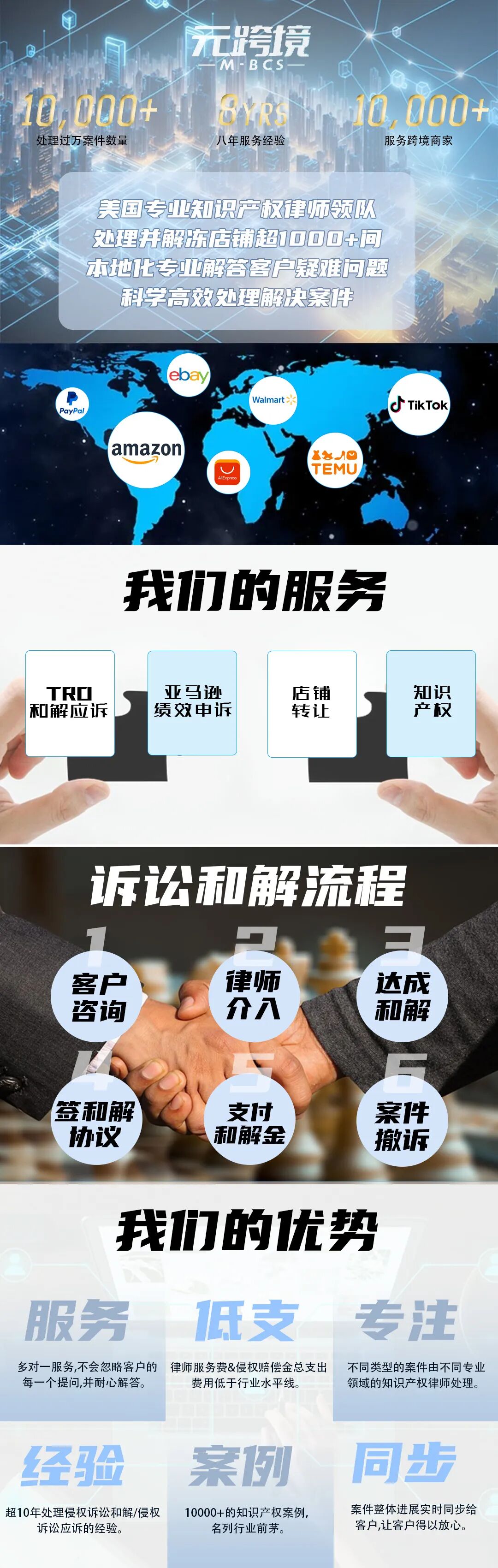 如果您不幸收到TRO邮件,店铺资金被冻结,可联系元跨境免费为您提供和解方案。如果委托元跨境为您进行和解服务,最终和解金额不接受,元跨境不收取您任何费用。