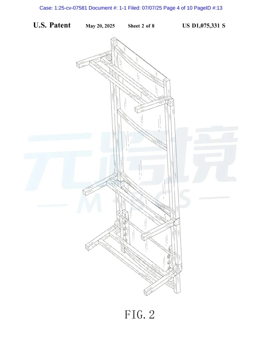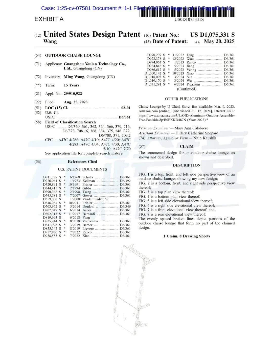 本案为专利侵权,拥有美国专利 US D1,075,331S(名称为 “OUTDOOR CHAISE LOUNGE”,即 “户外躺椅”)
