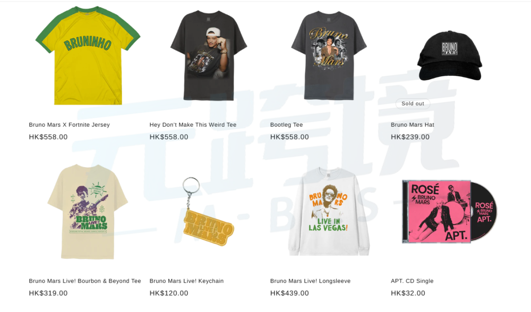 其中,Bruno Mars(本名 Peter Gene Hernandez)是 Merch Traffic 合作矩阵中的重磅 IP。这位出生于夏威夷音乐世家的多面手,将流行、R&B、放克、灵魂、雷鬼与摇滚熔于一炉。截至 2025 年,他已累计获得 15 座格莱美,全球专辑销量突破 60 白金,单曲销量逾 1.3 亿张,稳坐当代流行乐坛的标志性席位。