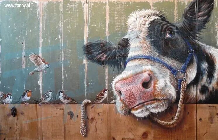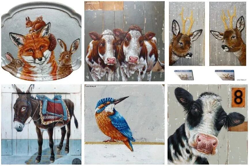 艺术家Fonny van der Veen以其在旧木板上创作带有拟人化动物纹理的画作而闻名。她从小就对动物和传统手工艺充满热爱,这些童年经历一直激励着她的艺术创作。在投身艺术领域之前,她曾在酒店行业工作,后来在一家绘画店找到了自己的艺术使命。她开始接受委托创作墙面装饰,逐渐形成了独特的个人风格,并转向在画布上创作。受到破损篱笆木块的启发,她开始尝试在旧木上作画,结合丙烯颜料探索木材的纹理和质感,将木材的质朴之美与拟人化的动物形象相结合,创造出富有深度和个性的艺术风格。