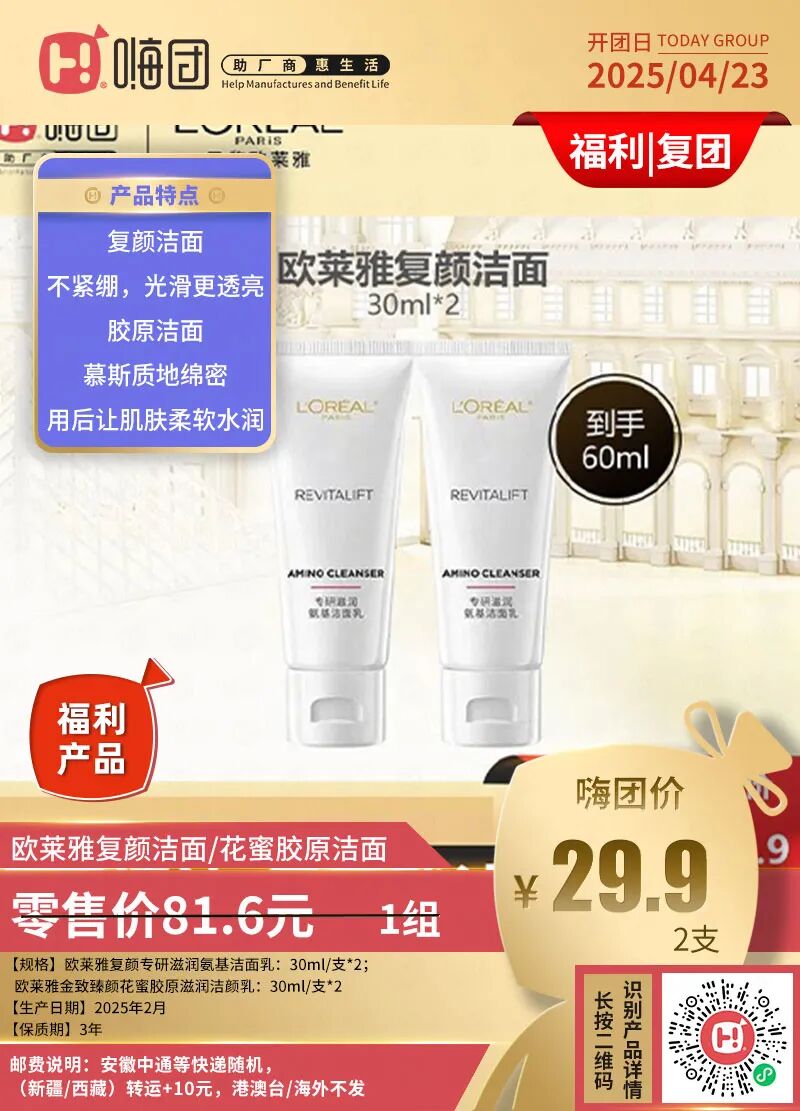欧莱雅复颜洁面/花蜜胶原洁面 29.9元1组2支‼ 推荐理由