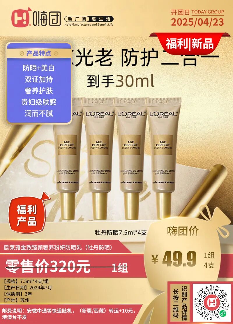 欧莱雅金致臻颜奢养粉妍防晒乳(牡丹防晒) 49.9元1组4支‼ 推荐理由