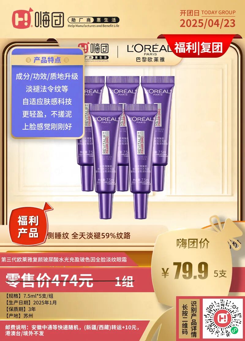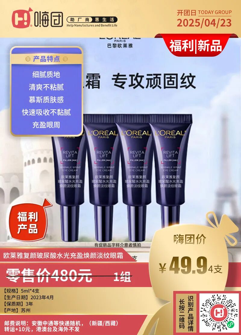 欧莱雅复颜玻尿酸水光充盈焕颜淡纹眼霜 49.9元1组4支‼ 推荐理由